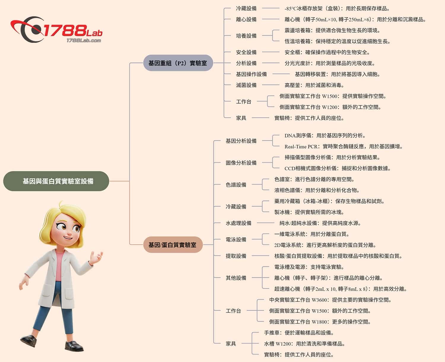 具備測序儀和PCR進行基因和蛋白質實驗是完善設計規劃實驗室。且另設一個基因重組(P2)實驗室。