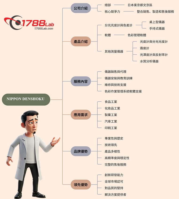 NIPPON DENSHOKU INDUSTRIES Co., Ltd. 創立於1960年2月,總部位於日本東京都文京區。其核心競爭力在於整合銷售、製造和售後服務的研發體系。他們提供多種不同用途的測量儀器,並開發用於PC端顏色管理的軟體。