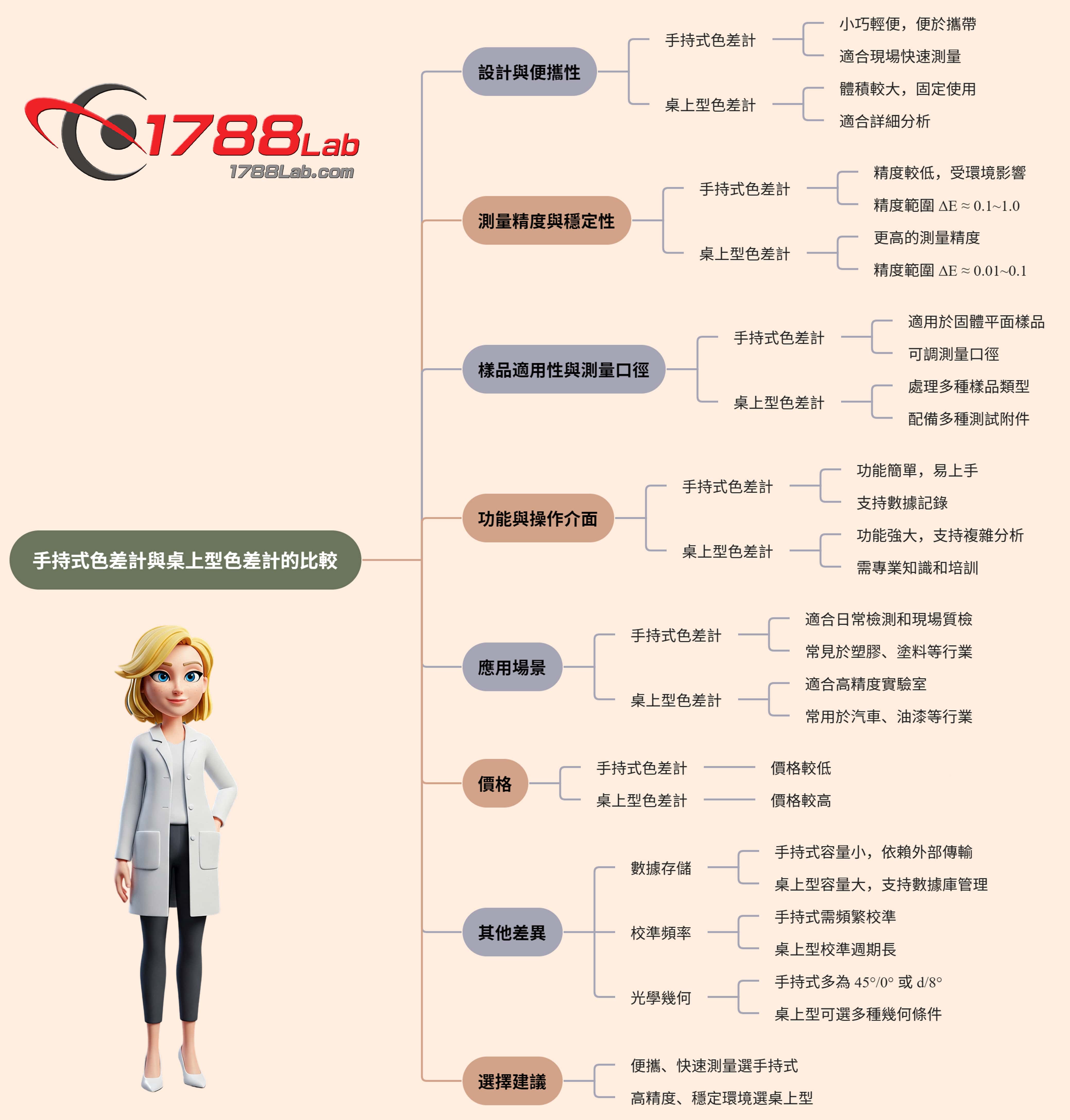 - 若您需要方便攜帶、快速測量、成本考量,且對精度要求中高(工業級,如 ΔE<0.5),手持式色差計會是較好的選擇,尤其是高階型號能達到桌上型的精度。